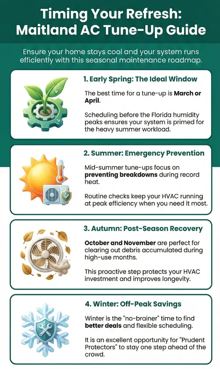 Schedule your AC tune-up in Maitland during late winter or early spring—February through March is ideal—before the summer rush hits and appointment availability tightens.